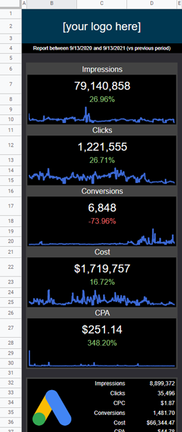Easily create and customize a PPC dashboard that supports 11 of the most popular advertising platforms. Monitor KPIs like impressions, clicks, conversions, spend, and CPA across ad networks. Compare KPI performance to the previous period. This template is great for macro-level campaign monitoring, budget decisions, client reports, etc.